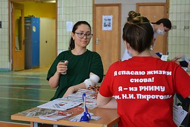 Донорское движение в Российском национальном исследовательском медицинском университете – это годовой план-график донорских и иных акций. На 14, 19 и 21 марта у нас были запланированы акции, которые мы не отменяли. Эти мероприятия и стали тренировкой перед большой акцией «Добро у нас в крови». 19 марта мы провели традиционный День донора в университетской клинике - Научно-исследовательском клиническом институте педиатрии им. академика Ю.Е. Вельтищева, где регулярно сдают кровь представители администрации, врачи, медицинские сестры, ординаторы. А 14 и 21 марта в общежитии и медицинском центре были проведены уникальные акции по карантинизации плазмы, на которые были приглашены доноры, которые в последний раз сдавали кровь у нас или в Центре крови им. О.К. Гаврилова в 2017-2018 году. Эти три донорских дня мы провели с соблюдением мер по предупреждению распространения инфекций. Мы медицинский вуз, эти меры для нас привычные. На входе волонтер в маске измерял температуру потенциальному донору бесконтактным термометром и предлагал антисептик для рук, а другие контролировали соблюдение дистанции и режим проветривания.