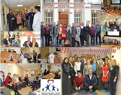 НФ «Национальный фонд развития здравоохранения» при поддержке Комитета общественных связей города Москвы с 5 по 16 ноября 2013 на базе Центра крови ПМГМУ им. И.М. Сеченова организовал подготовку организаторов донорского движения. «Школа доноров» — это обучающий курс для организаторов и волонтеров донорского движения, сочетающий в себе теоретические знания и практические навыки.