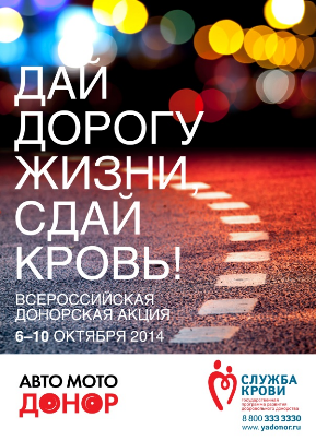 С 6 по 10 октября 2014 года в рамках государственной Программы развития добровольного донорства крови и ее компонентов пройдет традиционная Всероссийская донорская акция «Авто-МотоДонор» для всех участников дорожного движения страны, неравнодушных к теме донорства крови.