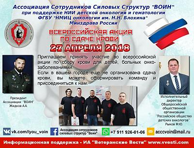 Чужих детей не бывает», особенно, если этим детям нужна помощь! - это лозунг всероссийской акции «Воин-донор». В партнерстве с Онкологическим центром Блохина уже несколько лет Ассоциация сотрудников силовых структур «Воин» проводит донорскую акцию, чтобы дать маленький шанс на спасение детям с онкологическими заболеваниями. С каждым годом список городов растет вместе с количеством спасенных жизней. Участники акции призывают не оставаться на стороне равнодушных и внести свою лепту.