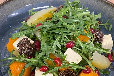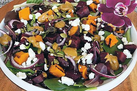 За сладость в этом салате отвечают свекла и тыква. Козий сыр уравновешивает сладость своим кисло-соленым вкусом. Предлагаем приготовить этот салат и увидеть интересную гастрономическую игру с балансом вкусов.