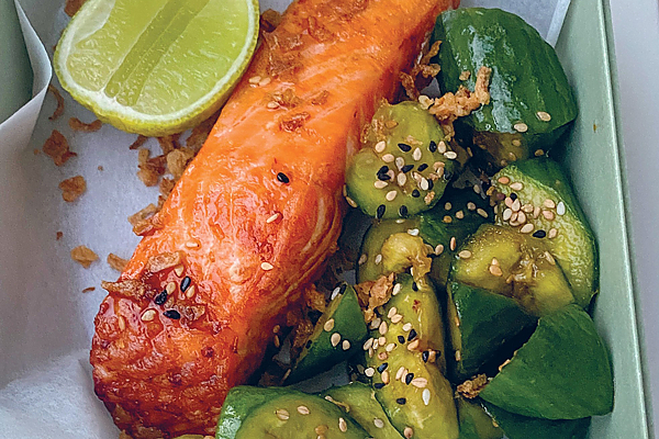 Еда с собой или обед в ланчбоксе может быть нескучным. Запеченный лосось с битыми огурцами – очень простой рецепт, благодаря которому обед или ранний ужин даже вне тарелки будет смотреться великолепно.