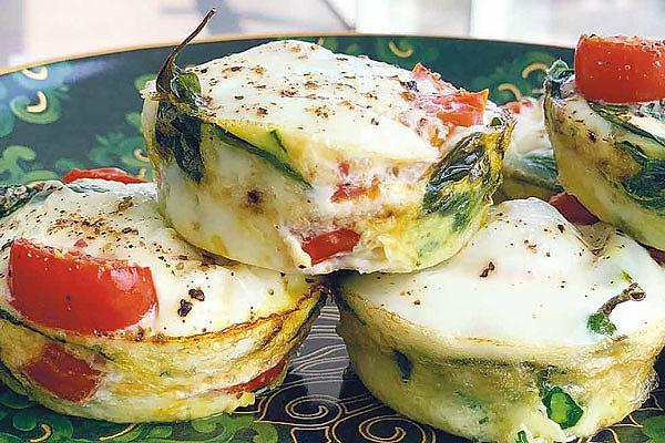 В формочки для маффинов постелите по листочку шпината, добавьте порезанные на четвертинки помидорчики и залейте все яичным белком.