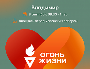 8 сентября во Владимире пройдут мероприятия второго этапа Всероссийской эстафеты факела «Огонь жизни». Эстафету запустили ФМБА России совместно с Фондом добрых дел «Благодействие» и Фондом поддержки социальных инициатив «Огонь жизни». В первом этапе эстафеты, объединившем более 50 городов, приняли участие свыше 84 тыс. человек, более 50 тыс. совершили донации крови, а Федеральный регистр доноров костного мозга пополнился на 8 тысяч потенциальных доноров.
