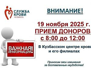 Уважаемые доноры! По техническим причинам прием доноров 19.11.2025 г. ГКУЗ "Кузбасский центр крови" в городах Кемерово, Новокузнецк, Белово, Прокопьевск и Анжеро-Судженск будет осуществляться до 12:00 ! С 20.11.2025 г. прием доноров в Кузбасском центре крови и его филиалах будет осуществляться согласно режиму работы.