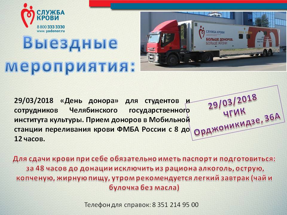 18 и 19/04/2018 День донора для студентов ЮУРГУ, пересечение ул.Тернопольской и пр.Ленина.